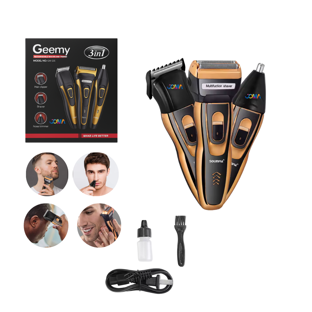 ¡Luce siempre impecable con la Patillera Geemy 3 en 1! Este set multifuncional está diseñado para quienes buscan practicidad y estilo. Con sus tres cabezales intercambiables, podrás realizar cortes de cabello, rasurados y retoques en nariz y orejas con total precisión.